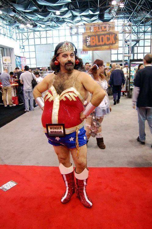 Yakin lah sumpah nyong ngakak, mau jadi Wonder woman kenapa cosplayernya laki-laki, gendut, buncit dan dada berbulu? ya jelas lah orang di sabuknya tertulis Wonder Wobear. hahaha