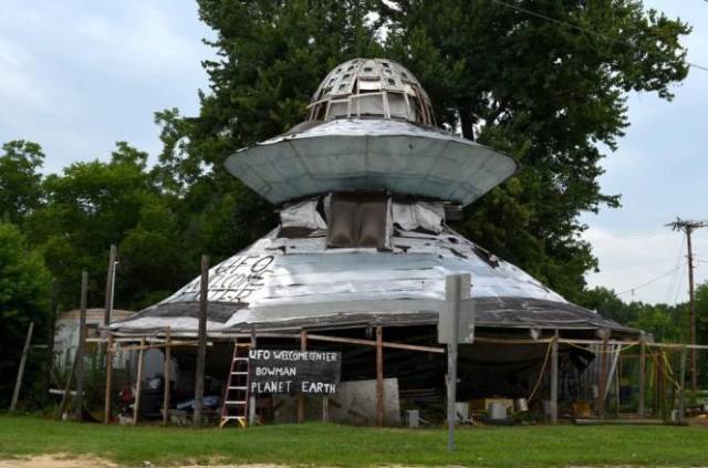 UFO welcome center di bangun seorang diri oleh pria bernama Bowman asal Carolina Utara pada tahun 1999. Tapi kelihatannya tidak welcome tuh bangunanya. Reyot-reyot.