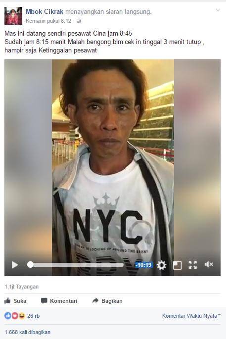 Baru-baru ini beredar video yang bisa di bilang lucu sekaligus kasihan, di langsir dari akun Facebook Mbok Cikrak (10/5/2017) mengunggah video pada hari hari Rabu, Pukul 8.12 waktu setempat yang berjudul, "Mas ini datang sendiri pesawat Cina jam 8:45, Sudah jam 8.15 menit malah bengong blm cek in tinggal 3 menit tutup, hampir saja ketinggalan pesawat", tulis Mbok Cikrak.