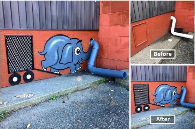 Lihat, cuman saluran air dan sebuah kotak di tembok saja bisa di sulap menjadi gajah ting-ting yang lucu dan imut.. masa kamu ngak suka??